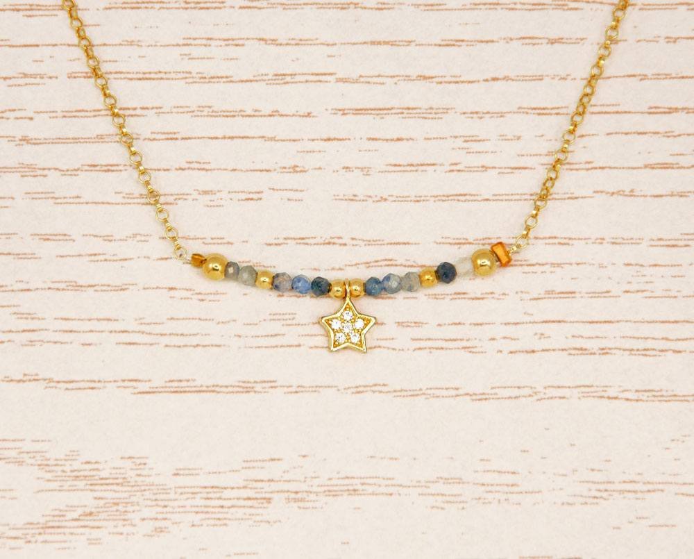 Está compuesto por 1 cadena de Plata de de 1ª Ley y piedras minerales minerales separadas por pequeñas bolitas también de plata, y un colgante central en forma de estrella con circonitas.