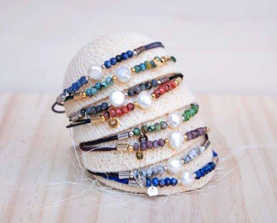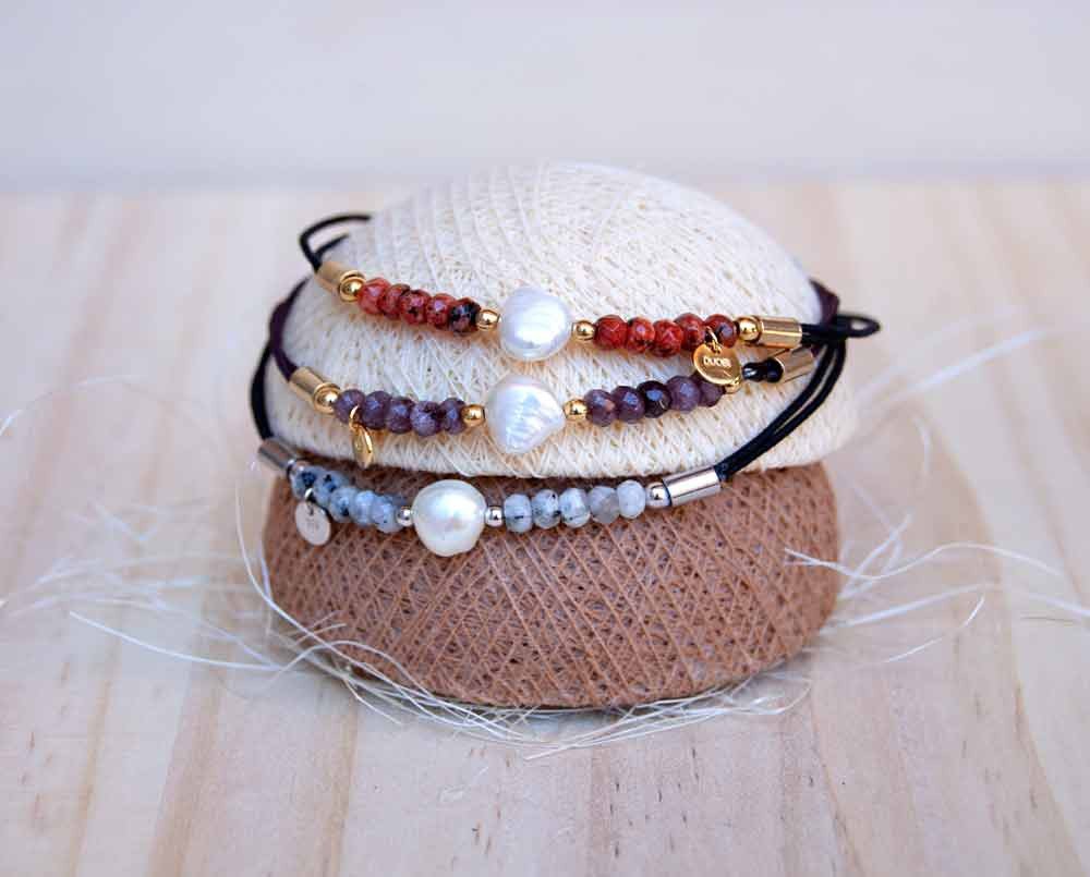La pulsera Paige es una joya muy fina y bonita. Se trata de una goma elástica de color con piedras minerales y una perla cultivada central y piezas de Plata de 1ª Ley.